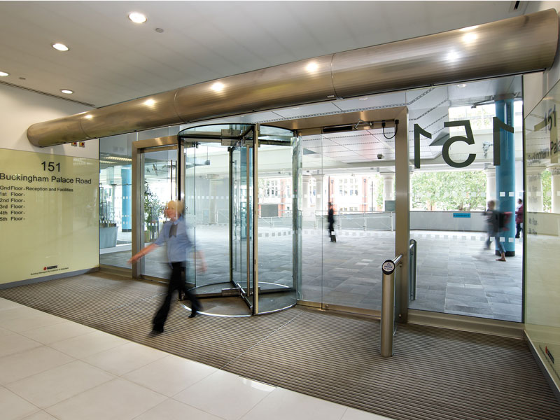 “The massive cubic space of our entrance atrium was proving a challenge to heat because the revolving doors were acting as a huge fan, bringing in cold air with every turn. The Rund air curtains, positioned vertically either side of the doorway, are able to cope with this, keeping out the draught and providing sufficient heating for our reception staff. We have had no complaints of cold over the winter season and have been able to maintain a low heat output setting.”